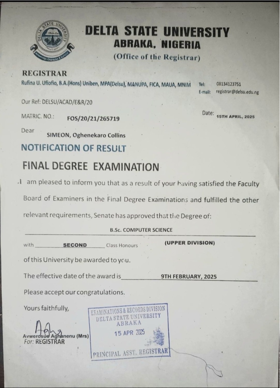 I hold a Bachelor of Science (B.Sc.) degree in Computer Science from Delta State University, Abraka.